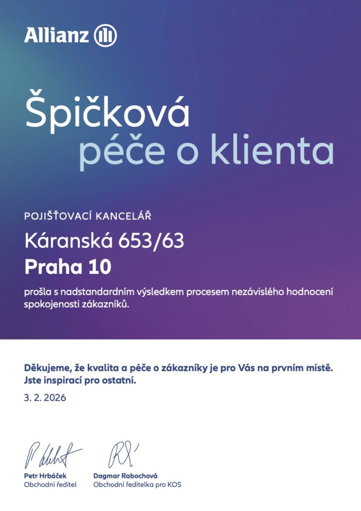 Spolupracuji s pojišťovnou Allianz – jednou z největších a nejdůvěryhodnějších pojišťoven na trhu.